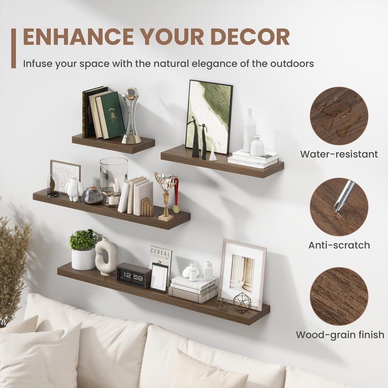 - [EASY INSTALLATION WITH FULL INSTRUCTIONS]: Our floating shelves come with all mounting hardware and an easy-to-follow guide, allowing for quick setup in less than 10 minutes. With step-by-step instructions, you can enjoy these beautiful shelves with minimal effort, adding an instant upgrade to your space.