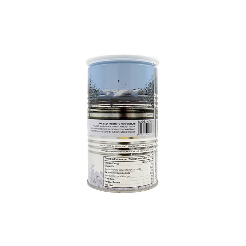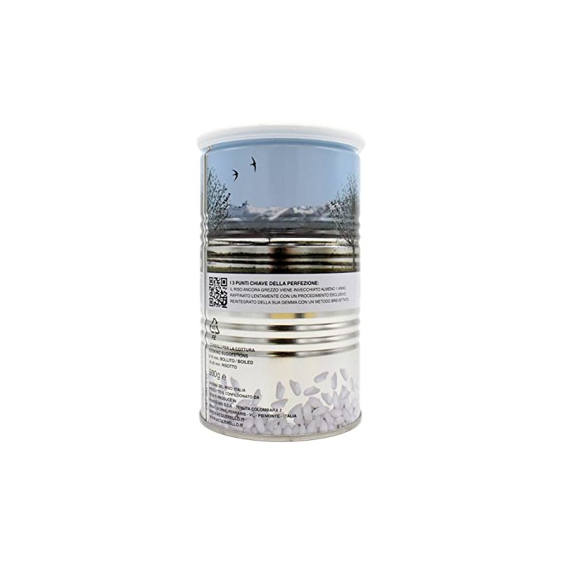 Grown, harvested and packed at Tenuta Colombara. Processing Technique: Only the rice grains that pass the 20 processing and selection steps become Acquerello. One of them is the helix, still considered the best method for rice whitening: rice grains rub one against the other, avoiding any damage. Aging: Starch is stabilized, thus the rice grain will release less starch during cooking and will increase liquid absorption. Germ is the vital part of a rice grain. It contains most of the vitamins and micronutrients of rice. During whitening the germ separates from the rice grain, but thanks to a patented process we are able to restore it within the grain, enhancing its nutritional values. Lavorazione: Sono necessari 20 delicati passaggi per arrivare ad ottenere riso Acquerello. A partire dall’elica, ancora oggi considerata il miglior metodo per sbiancare il riso attraverso lo sfregamento dei chicchi. Invecchiamento: Il riso grezzo viene fatto invecchiare almeno un anno in silos a temperatura controllata inferiore ai 15°. L'amido si stabilizza e durante la cottura si disperde meno, ogni singolo chicco aumenta la capacità di assorbimento dei condimenti. Sull’1% della nostra riserva abbiamo esteso l’invecchiamento fino a 7 anni, per ottenere un prodotto per le cucine più esigenti. La gemma è la parte vitale del riso, e contiene la maggioranza delle vitamine e dei microelementi. Durante la lavorazione la gemma viene separata dal chicco, ma grazie ad un procedimento brevettato in Acquerello viene reintegrata. Per unire il gusto del riso bianco con gli elementi nutritivi del riso integrale.