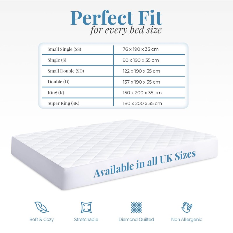 - ✔ Perfect Mattress Fit: Available in Small Single (76x190cm), Single (90x190cm), Small Double(122x190cm), Double (137x190cm), King (150x200cm), and Super King (180x200cm), this single mattress protector fitted 90cm x 190cm has up to 35cm deep skirt. The elasticized fitted skirt ensures a secure, non-slip grip, keeping the protector in place all night without shifting. Whether you have a memory foam, hybrid, or spring mattress, this protector molds perfectly to your bed, maintaining a sleek and wrinkle-free look while offering full coverage and protection.