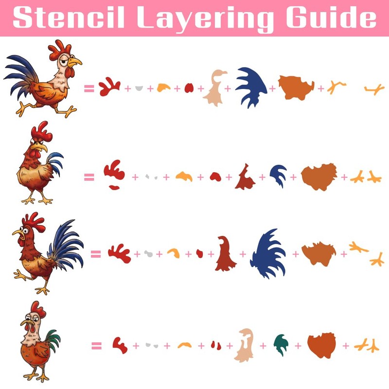 - CLEAR STAMPS DIES AND STENCIL SET: Package Includes cartoon Rooster clear stamps and dies for card making, layering PET stencils. You can stamp chicken outline on your card, then use the PET stencil to layer coloring. And use the cutting dies to cut the rooster shape. Finally, combine the cut rooster shapes onto your card to create a bouquet of 3D rooster.