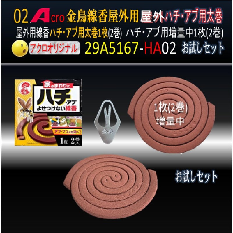 - Acro Kinotori 29A5167 Outdoor Bee Abu Incense 01 Piece (02 Rolls) 29A5167-HA02 Size: Diameter approx. 4.3 inches (11 cm) Weight: approx. 0.7 oz (20 g) per roll (estimate) 6 hours (1 roll) 1 Incense that does not leave bee abu around the house. For outdoor use only. Thick coil (3) Thick coil for outdoor use that does not repel bees, 1 piece (2 rolls). Size: Maximum outer diameter 4.5 inches (115 mm), minimum outer diameter 4.3 inches (110 mm) x thickness 0.2 inches (6 mm). Usage time (approximate): 6 hours (1 roll). Weight: Approx. 0.7 oz (20 g) per spool. Effective ingredients: Pyrethroid (20 g). Acinagabee, Honeybee, Ab, Buyu, Yusulika, Butterfly Flee, Ga, Side Bai Not suitable for: Wasp bees are not eligible, so please consult a specialist for repelling etc