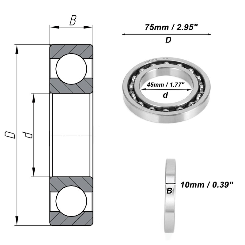 • Specification:Outer Diameter: 75mm / 2.95", Inner Diameter: 45mm / 1.77", Width: 10mm / 0.39", Type: 16009, Precision Level: P6, Basic Load Ratings (kN): Cr:14.9 C0r:11.4, Limiting Speeds(min-1): Grease:9000 Oil:11000