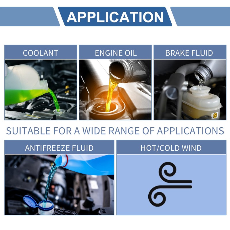 - Applications: Applies to Coolant, Engine Oil, Brake Fluid, Antifreeze Fluid, Hot/Cold Wind, etc.