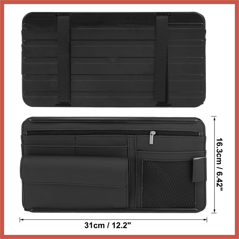 - Auto Parts: [Enough Storage Space] The sun visor organizer with sunglasses case, storage nets and zipper storage bag, can store some small items, such as flashlight, pens, pencils, small notepads, emergency rescue tools, cards, glasses, business card holders, etc, keeps your car clean and tidy.