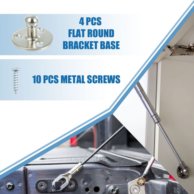 - PACKAGE INCLUDES - 10 Screws, 2 Diagonal Long Gas Springs, 2 Flat Round Bracket Bases.