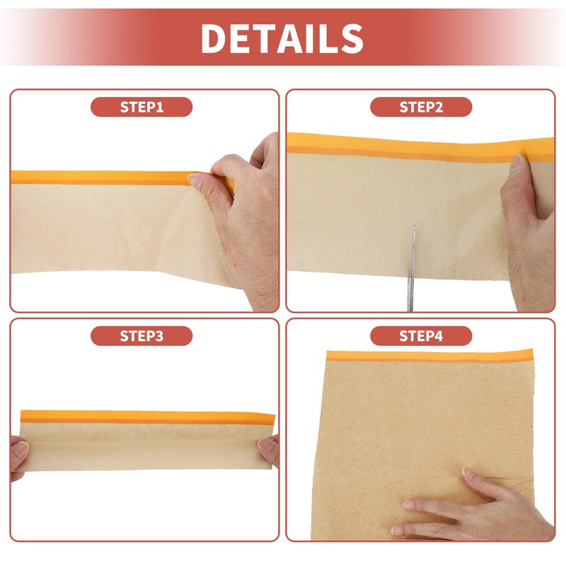 - Specification: This pretaped masking paper features with masking paper and painter tape together, quick and easy protection for most surfaces, saving your time in painting.