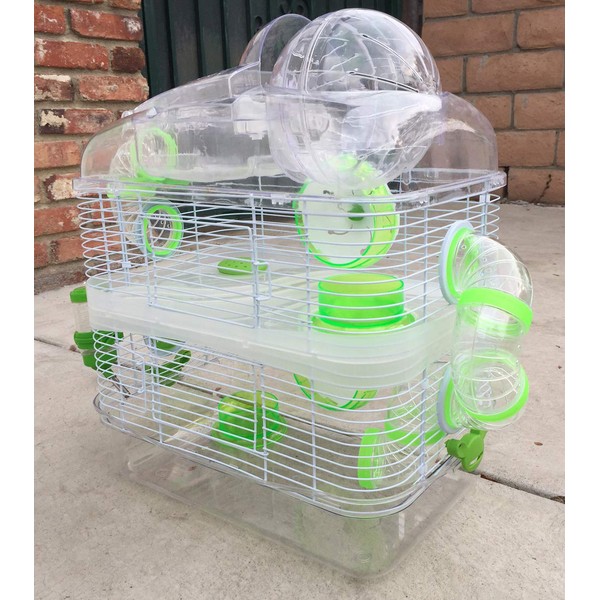 • Two front doors. Comes with one water bottle and Complete Food dishes and exercise wheels for each level