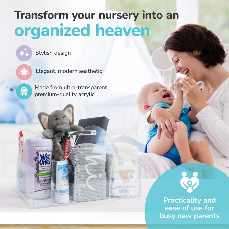 - STYLISH DESIGN: Elevate your nursery decor with our sophisticated acrylic diaper caddy organizer, blending seamlessly with all your baby room essentials. Made from ultra-transparent, premium-quality acrylic, this diaper basket organizer provides an elegant, modern aesthetic, complementing nursery storage beautifully while maintaining practicality and ease of use for busy new parents.