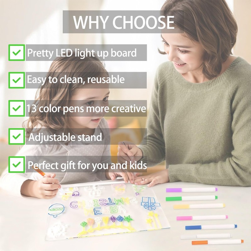 - 【Led drawing board】 This interesting drawing board comes with 13 color-pen, that allows children to write or draw in a more imagination environment. When children have new ideas or create something unique, they can use our glowing board to record it at any time. Led note board with colors is the best back-to-school gift for kids during the school season