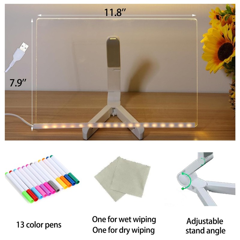 - 【LED Acrylic color board】Clear desktop acrylic dry erase board is reusable and durable, sized at 11.8” x 7.9”,and has 13 color-pens It can be used as a message board or a drawing board . It is with LED light, featuring a classic, fashionable, and clear appearance design, perfect for decorate your house and office.