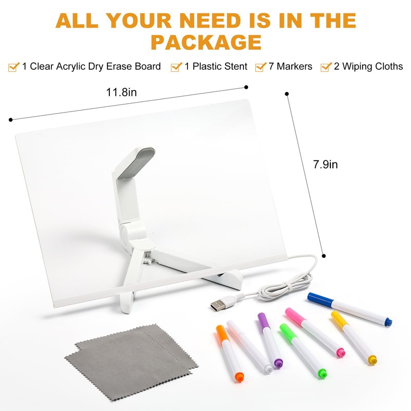 - HOW TO USE: Please remove the double-sided protective film from the acrylic board before use. Write or draw what you need on the acrylic board, adjust the angle of the tripod, and place the note board on the tripod. Then, plug it in, and you will see the glowing text or lines. This kit includes 7 quick-drying markers, the quick-drying ink resists fading and smearing so your notes last as long as you need, simply wipe with a damp cloth or a paper towel. The board is easy to clean and can be used repeatedly