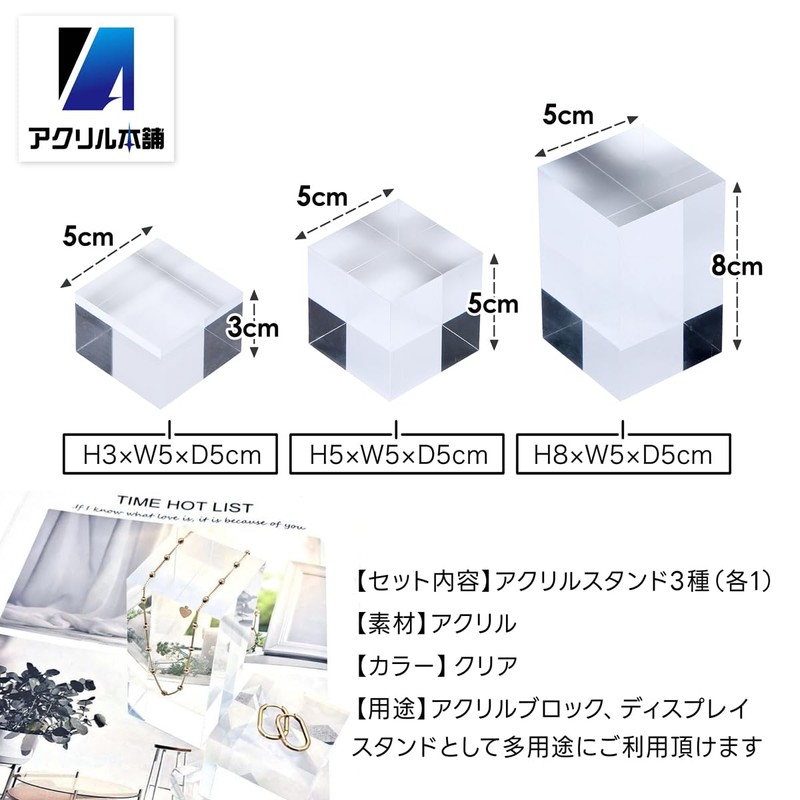 【Clear Acrylic Enhances Charm】 This set of 3 acrylic stands is made of high transparency acrylic material to maximize the charm of items you display with. Each of the different sizes of the base allows for efficient placement of display spaces and items. Ideal for taking pictures and displays: Perfect for product photos sold online and poster displays, small photo shoots, etc. Add a touch of class by simply placing your axa accessories or cosmetics to create a sophisticated display. They look great and make your items stand out. 【Lightweight & Durable Acrylic Material】 Made of acrylic so it is light and easy to carry. It can be repositioned smoothly. It is also highly durable, and the design will not break even if dropped, so you can use it with confidence. Set Contents: Acrylic stand x 3 types, 1. 2 x 2.0 x 1.2 inches (5 x 5 x 3 cm), 2.0 x 2.0 x 2.0 inches (5 x 5 x 8 cm), (1 piece each), (Color) Clear Material: Acrylic. Uses: Acrylic base, acrylic block, and display stand.