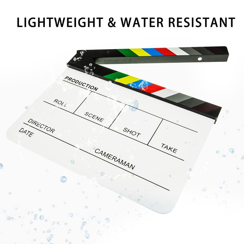 - This clapper board is made of arcylic and wood, easy to write, clean and reuse. Tip: It is best to use a water pen to write. Don't use the greasy pen, otherwite it can't be erased.