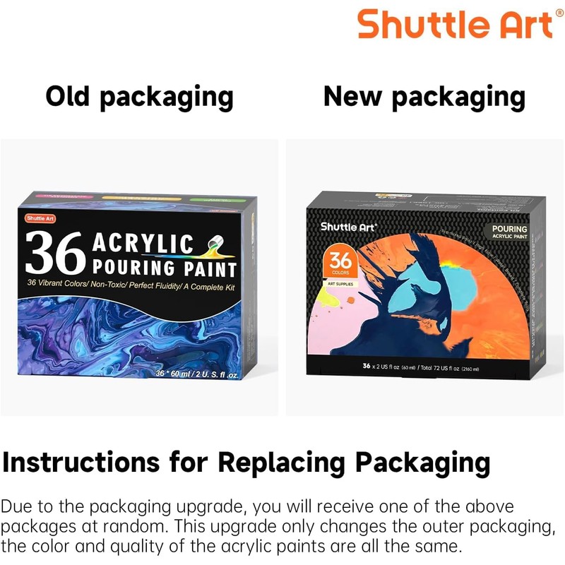 - COMPLETE ACRYLIC POURING PAINT KIT: Shuttle Art Acrylic Pouring Paint Set comes with 36 pre-mixed acrylic paints(2oz/60ml), 4Canvas Boards(2 Sizes), 60ml Silicone Oil, 10 Measuring Cups, 2 Tablecloths, 20 Painting Sticks, 1 Flower Strainer, 1 Art Knife and a user manual, all in a sturdy box, ideal for you to hone your pouring techniques and explore dazzling abstract art.