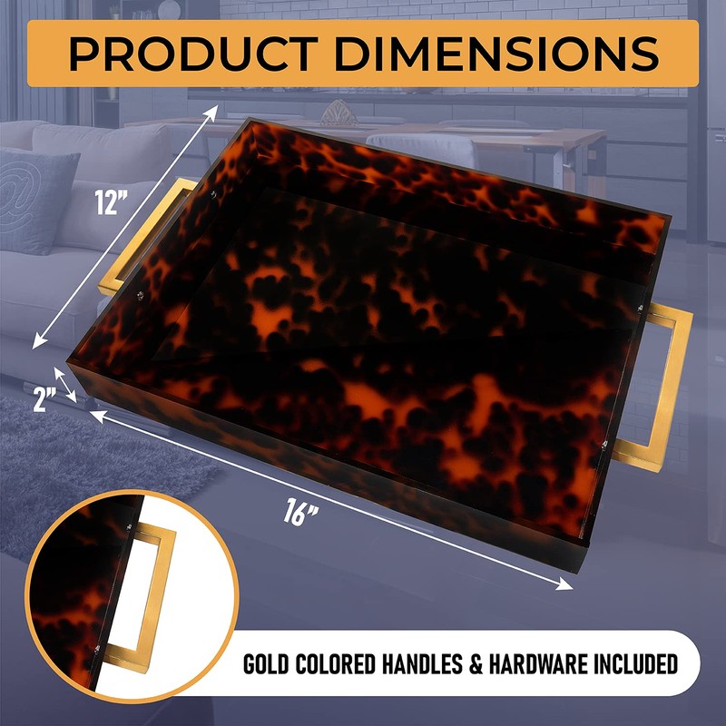 - Acrylic Tray with Handles - Contemporary serving tray with gold handles included. Available in five beautiful color options (clear, tortoise shell, marble, black glitter, and clear glitter). Product dimensions: 16" x 12" x 2" (not including the handles)