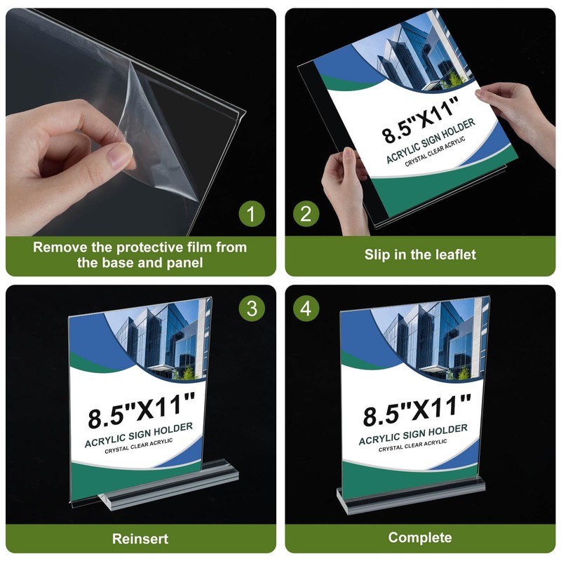 - Easy to Use: 8.5x11inches Display Table Signs Stand are Detachable, Convenient Carrying and Storing. Each Acrylic Sign Holder Has an Opening on Side and Bottom, Easy to Install and Change Content, Please Peel Off the Protective Film Before Use!