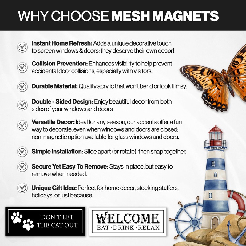 - Refresh your screen windows and doors from ordinary to EYE-CATCHING with Mesh Magnets! Instantly give them a stylish upgrade with our unique decorative accents—plus, you’ll help prevent accidental door collisions. A small change with Mesh Magnets can make a noticeable difference, so try something new for your home. It's about time they get their own style, just like regular doors do!