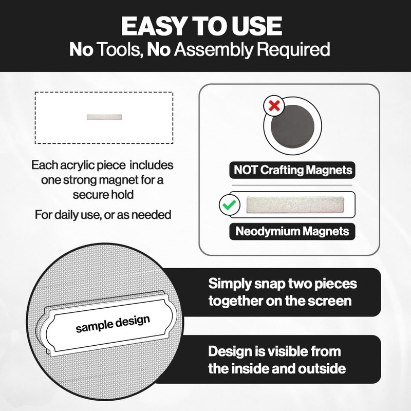 - With strong central magnets, this two-piece set is visible from both the interior and exterior. Simple installation: slide or rotate one piece to separate and then snap together. No assembly, no messy glue required. Stays securely in place, yet easy to remove when needed. Made from firm, quality acrylic, these won’t bend or look flimsy.
