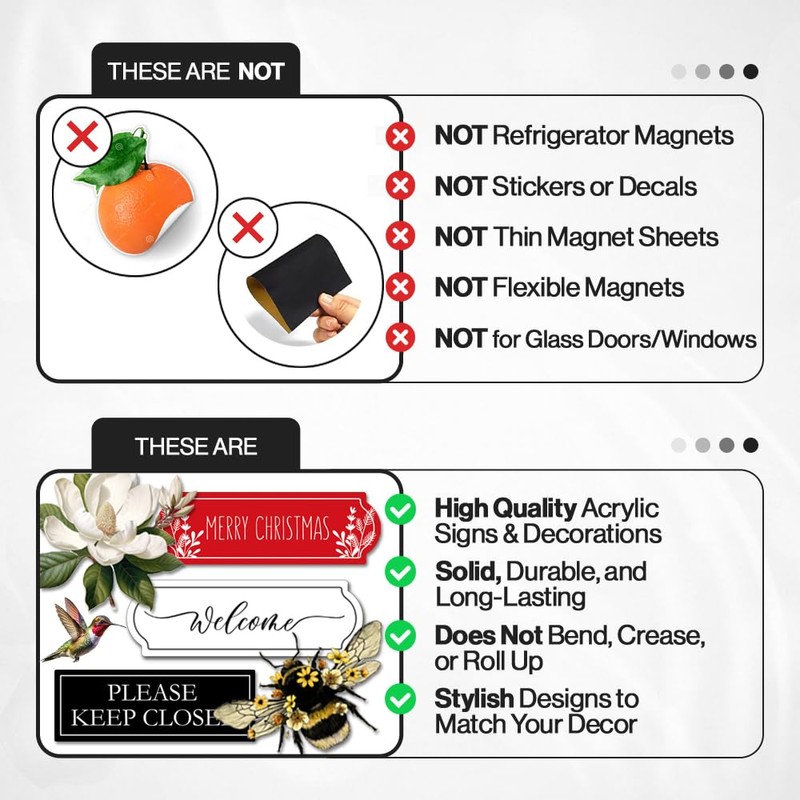 - Per Clear Acrylic Sign 10in x 9in x 2mm, 11.5in x 3.75in with clear borders not shown in photos; Per Magnet 2.25in x .25in x 2mm; 2mm gap from the sign to door due to the magnets. IMPORTANT: Position up high to keep out of reach of children and pets. Contains strong neodymium magnets that can break if used incorrectly. Keep away from pacemakers, other implanted medical devices, and electronics.