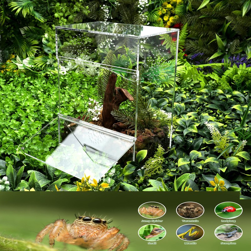 Acrylic Tarantula Enclosure Jumping Spider Enclosure with Front Opening Door 7.8 * 5.3 * 10 Inches Micro Habitat Terrarium for Small Tree Dwelling Reptiles, Spiders & Invertebrates (Enclosure&Feeder)