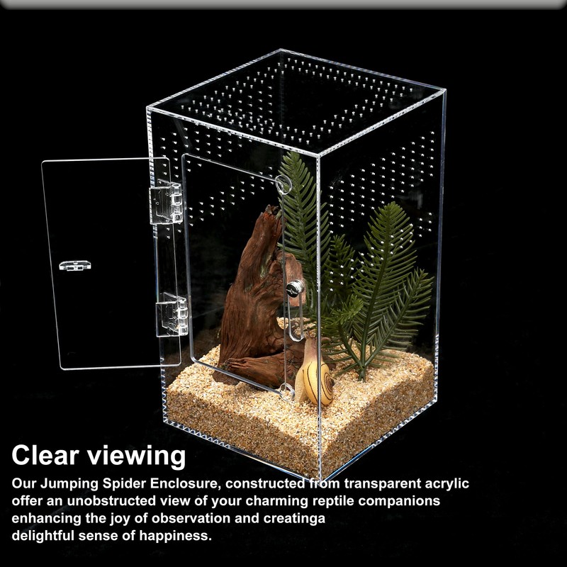 - All-in-one design, no assembly required, ready to use out of the box, waterproof bottom, front door (size 5.7*3.1 inches), our jumping spider habitat enclosure is equipped with a sturdy locking mechanism, safety latch, so that the door frame fits better, not easy to deform, more durable, can ensure that your spider stays safely in the designated habitat, giving you peace of mind and increased security.