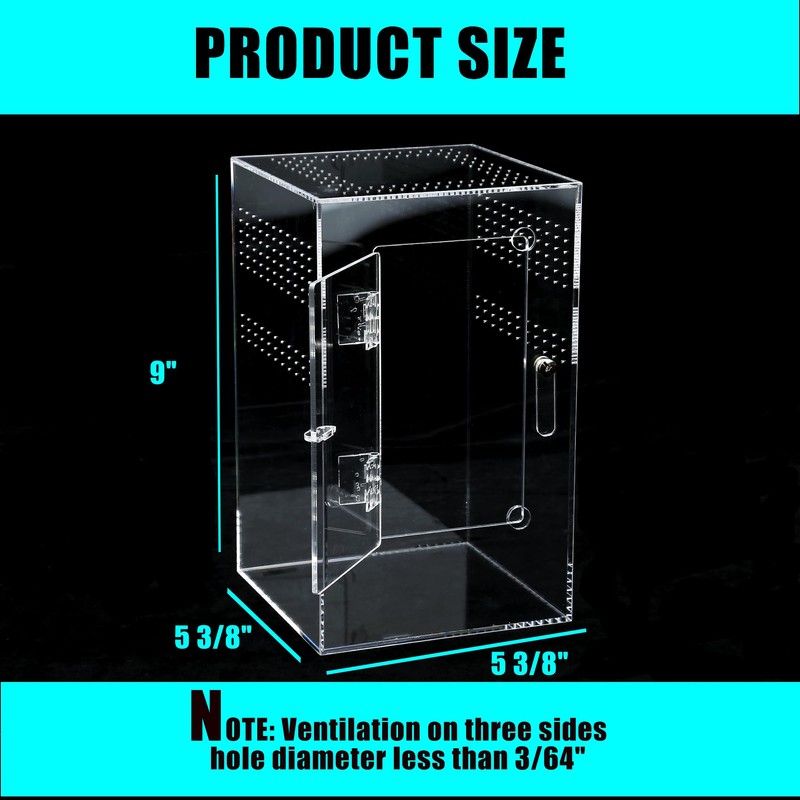 - Product size: 5.3*5.3*9 inches/13.5*13.5*23 cm; vent diameter 0.02 inches/0.5 mm; feeder bowl diameter is 1.5 inches, which is very suitable for jumping spider/wolf spider/mantis/snail habitats, and also very suitable for other small reptiles and amphibians or invertebrates.