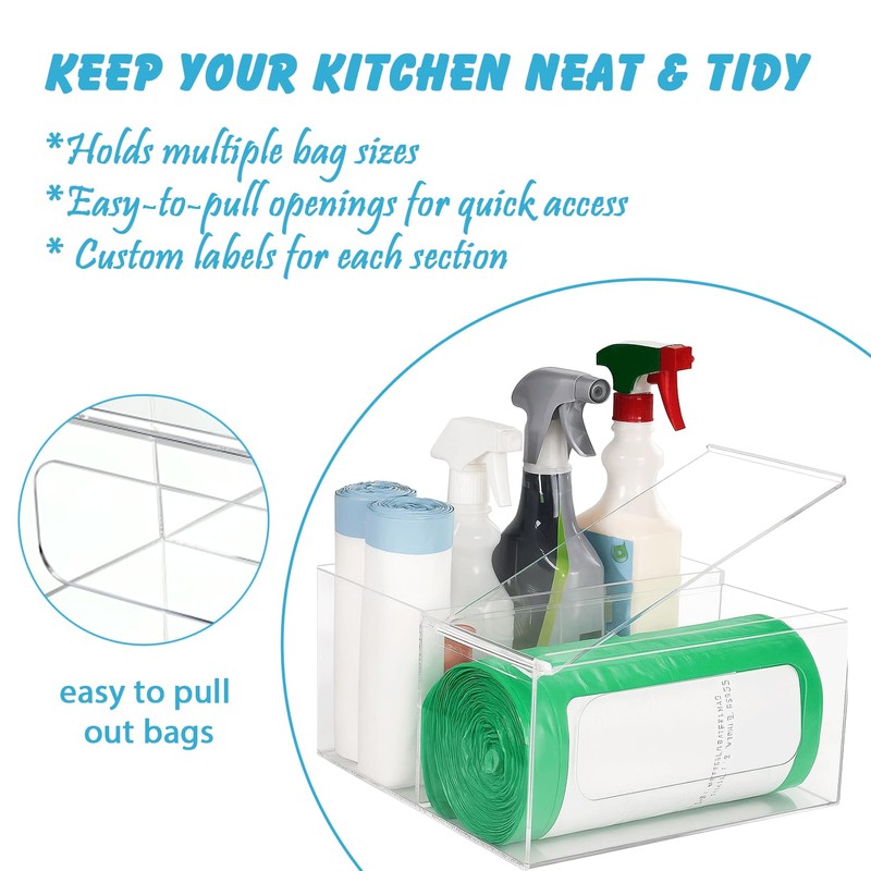 - 【Versatile & Easy to Use】 Ideal for kitchens, cabinets, bathrooms, pantries, garages, and offices, this acrylic trash bag dispenser fits 10/10.25/5.5 gallon standard trash bag rolls. No assembly needed, just place it under the sink or in a cabinet for instant organization.