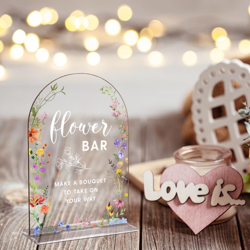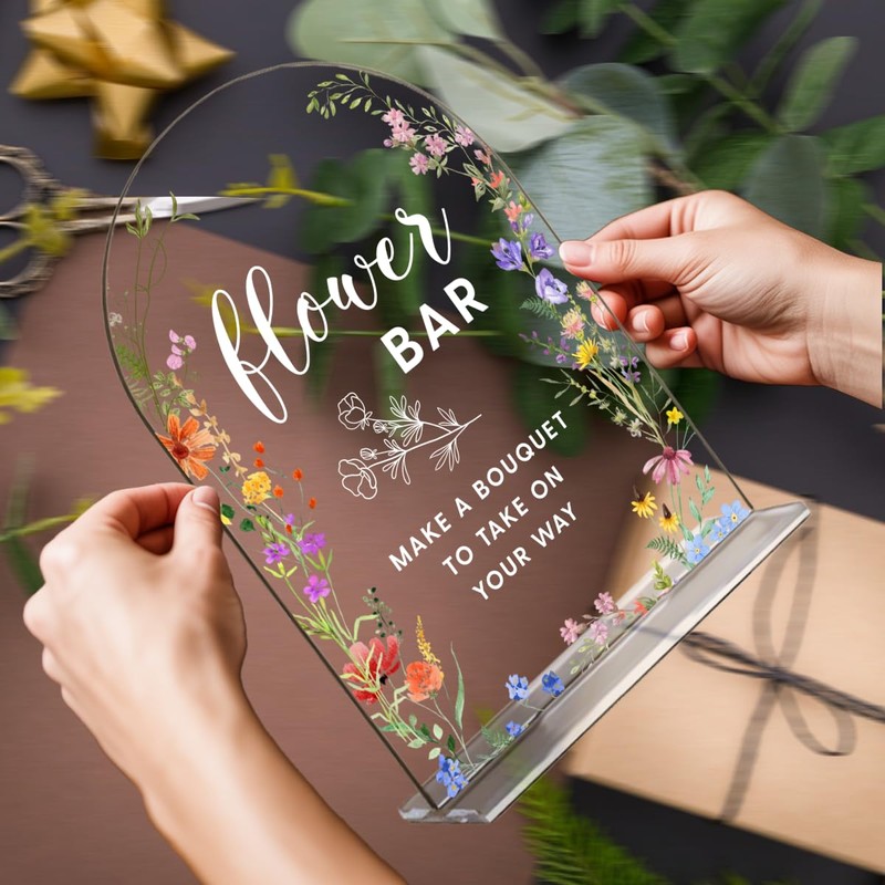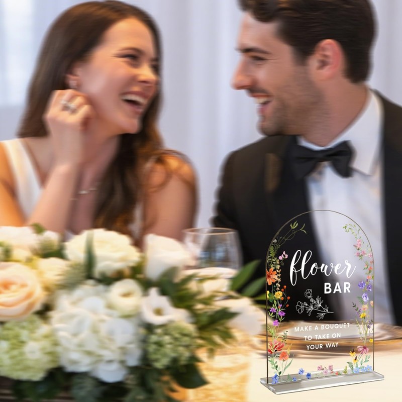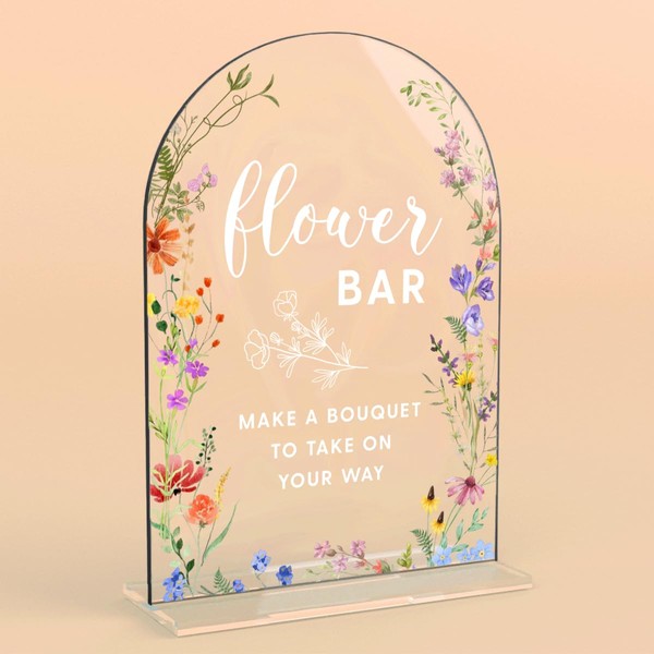 Acrylic Wedding Signs, Flower Bar Signs for Marriage Reception, Flower Bar Desk Decor, Modern Arched Round Top Acrylic Table Top Sign with Holder for Wedding Reception Party (Clear Wildflowers)