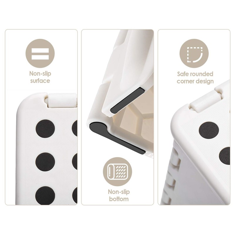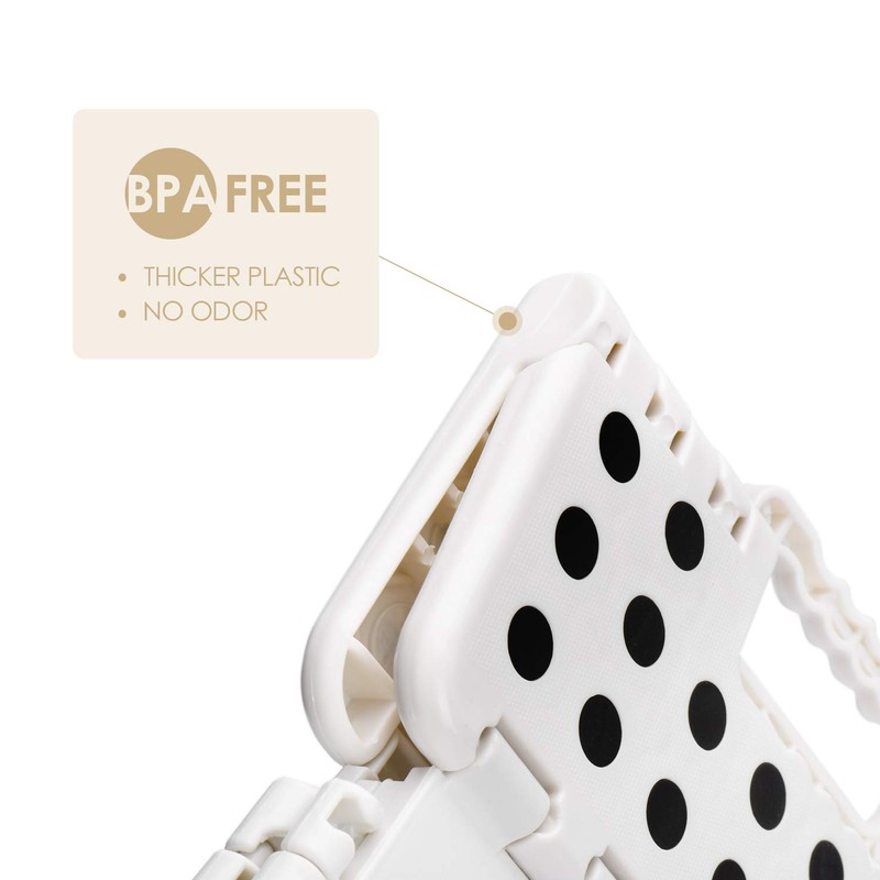 - ANTI SLIP - Special rubber dots on the surface and anti-slip black rubber strap on each foot for maximum foot grip and gives amazing comfort, preventing slippage. Unique, grip-dot textured surface makes the folding step stool safe for everyone. This safety features making the step stool great for multipurpose uses i.e. kitchen, bathroom, dining room, office, garden, camping, fishing and more.