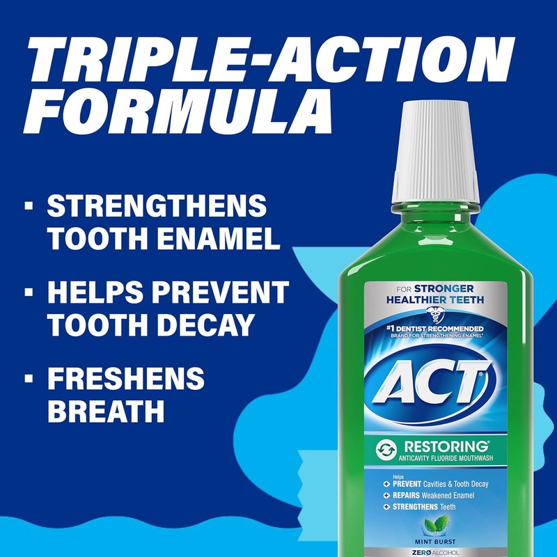 Help protect your teeth from weakening enamel and tooth decay with ACT Restoring Zero Alcohol Fluoride Mouthwash, Strengthens Tooth Enamel, Mint Burst. This mouth rinse is designed to help strengthen tooth enamel, remineralize soft spots, prevent cavities and freshen breath. In fact, anticavity rinses like ACT Restoring Mouthwash are up to 70% more effective at reducing cavities versus brushing with a fluoride toothpaste alone. This ACT Restoring Mouthwash comes in a Mint Burst flavor and is an alcohol-free mouthwash. When it comes to strong smiles, trust the No. 1 dentist recommended fluoride brand*. *Among mouth rinses.