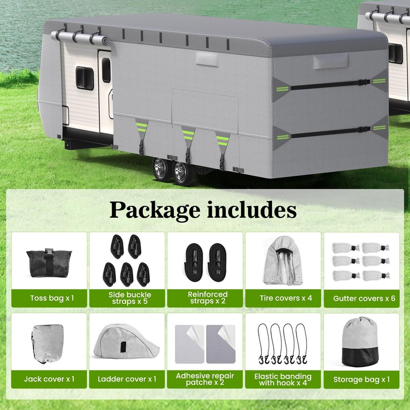 - 【Complete Kit & Hassle-Free Guarantee】Package includes: RV Cover1, Storage Bag1, Base Straps5, Extension Straps2, Rain Gutter Covers6, Ladder Cover1, Jack Cover1, Repair Patches2, Toss Bag1, User Manual1. ACTFLAME Travel Trailer Covers come with a 2-year guarantee. Please buy with confidence, we will always provide you with satisfactory solutions to any problems