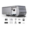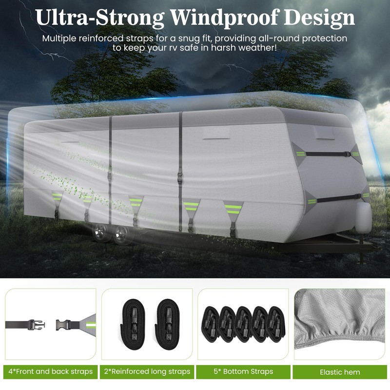 - 【Ultimate Windproof Performance】Engineered for extreme conditions, our RV cover features an elastic hem, 5 heavy-duty reinforced base straps, and 2 extra-long straps to secure your camper even in fierce winds. The four-sided tension panels distribute wind pressure evenly across the surface, minimizing stress and eliminating tearing risks