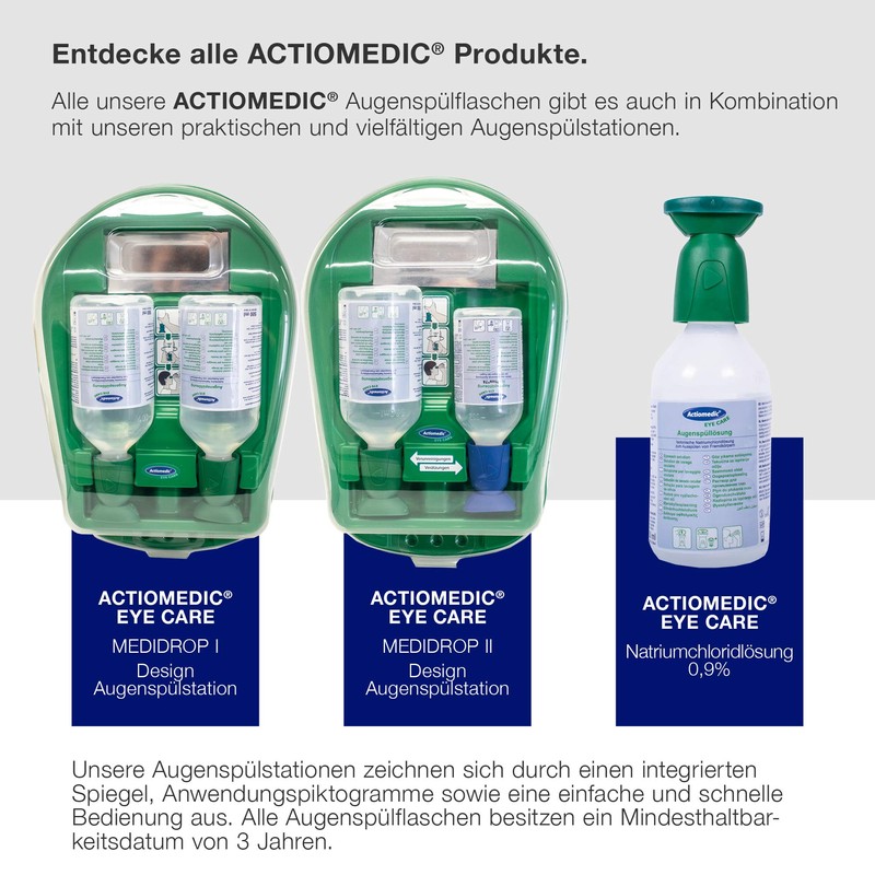 - High quality: all ACTIOMEDIC eye care products are approved medical devices under strict quality controls. This phosphate-buffered eye wash solution 4.9% complies with DIN EN 15 154-4 and has a shelf life of 3 years.