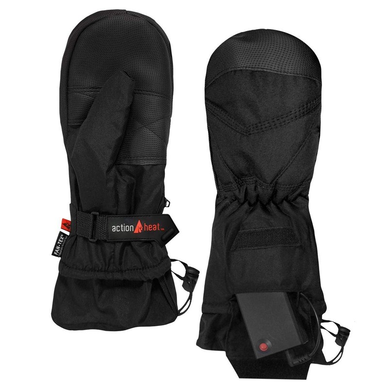- PRODUCT SPECIFICATIONS: ActionHeat unisex mittens in black come with two units of rechargeable AA power packs which require 3 batteries each (not included). Battery operated heated mittens have a safe locking cover.