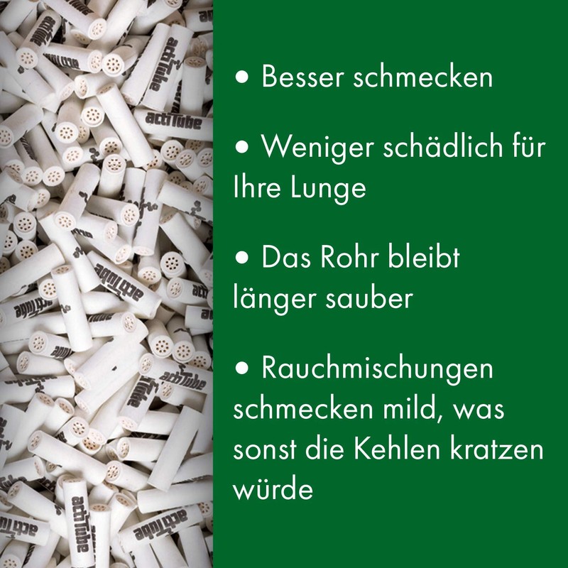 With activated carbon, a high proportion of harmful condensates are filtered out of the smoke. This means the majority of the harmful substances attach themselves to the active charcoal and are disposed of during filter changes. The smoke becomes pleasantly mild without detracting from its effects.