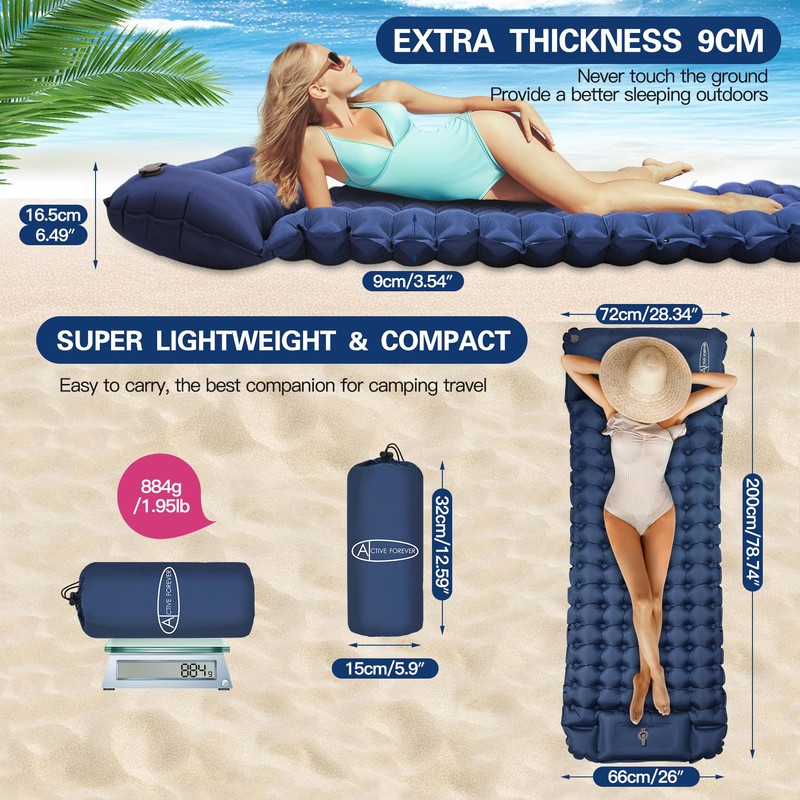 ACTIVE FOREVER Self-inflating Camping Mat, 9cm Thickness Inflatable Sleeping Mat with Pillow Built-in Foot Pump, Compact Waterproof Air Mattress for Outdoor Camping, Backpacking, Hiking, Beach, Blue