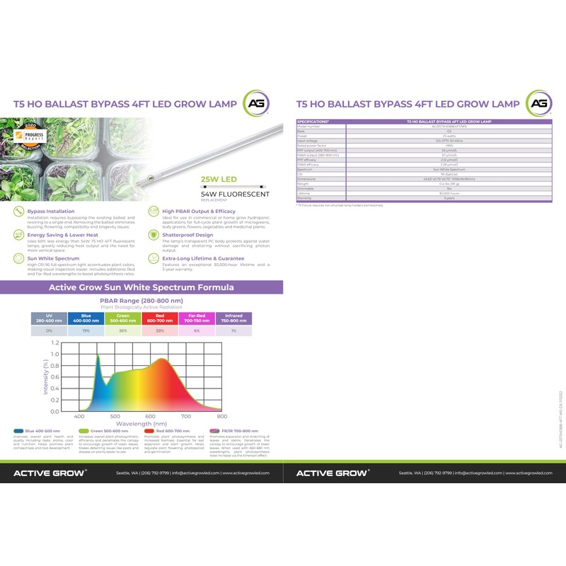 Active Grow T5 High Output 4FT LED Grow Light Bulb - T5 Grow Lights for Indoor Plants, Veg, Bloom, Greens & Microgreens - 25W - Sun White Full Spectrum High CRI 95 - Ballast Bypass 120-277V - 4-Pack
