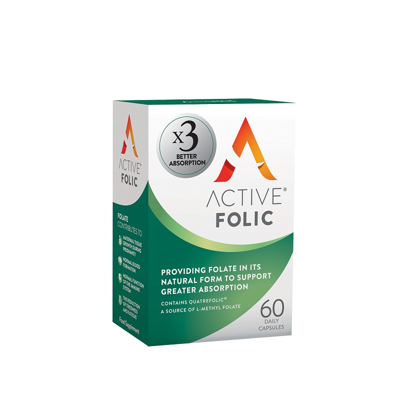 The Active Folic specifically designed for women to provide a nutritionally active form of folic acid required before conception, during pregnancy and lactation, as well as a variety of other phases except pregnancy. The innovative formulation contains the patented ingredient Quatrefolic ® , which provides three-fold absorption, compared to other forms of folate .