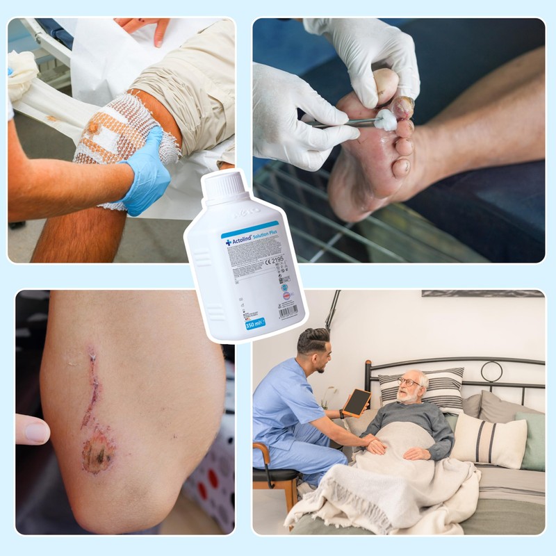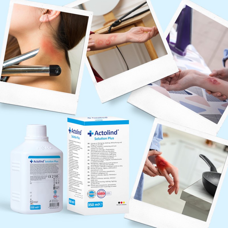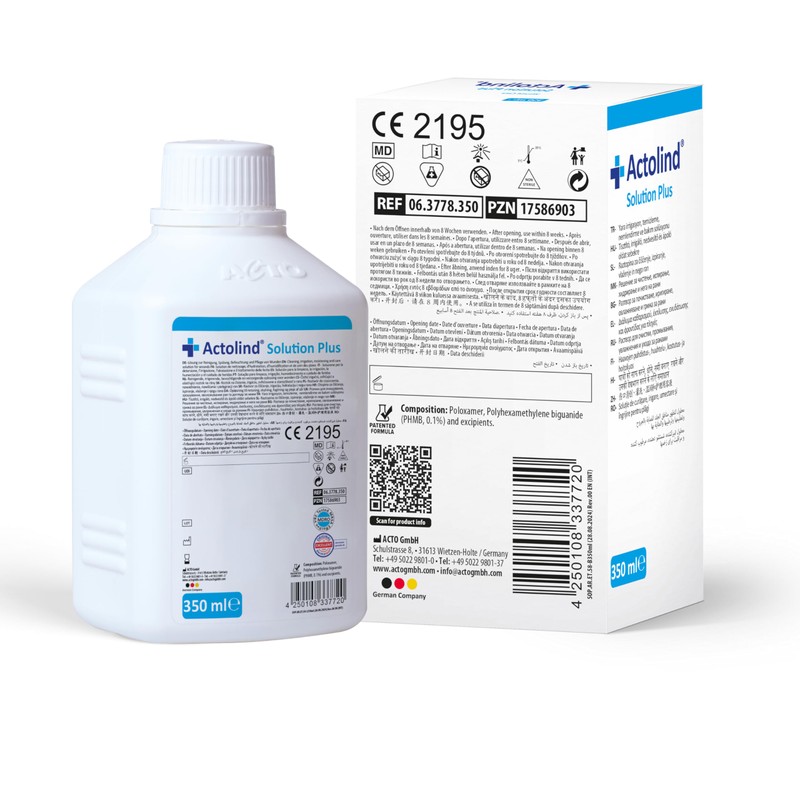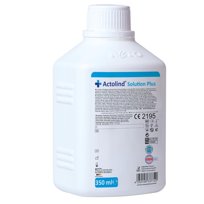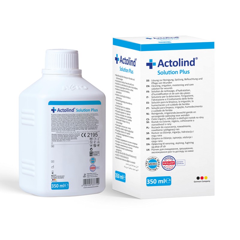 • Actolind Solution Plus is a cleansing, conditioning, moisturizing and conditioning solution used together with materials such as bandages, dressings, wound dressings and wound fillers on acute, chronic and infected wounds as well as first and second degree burns. It is also suitable for antiseptic cleansing, soaking and removal of dressings that are dried and adhered to the wound without causing secondary trauma.