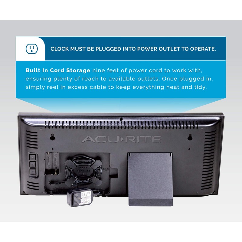 - Powered by a 9-Foot Power Adapter (required): Added length allows for placement anywhere in the room, with the excess able to be reeled into the integrated cord storage area on the back of this digital clock LED