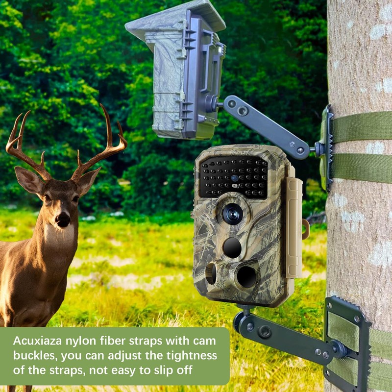 - 3. Easy To Use: Acuxiaza nylon fiber straps with cam buckles, you can adjust the tightness of the straps, after tightening the nylon straps will not move until the cam buckles are loosened, you can easily tie the hunting camera to the tree