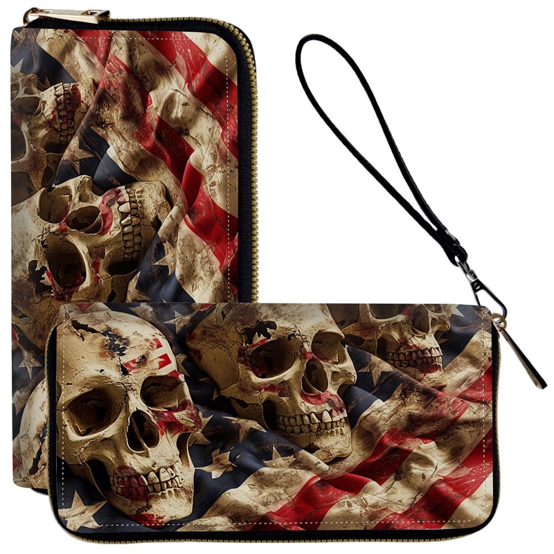 ACWDMKH Ladies Wallet,Clutch Purses for Women Wallets Leather Credit Card Holder for Women Wristlet Slim Small Cute with Zipper,Thin RFID Blocking with Wrist Strap,American Flag Skull