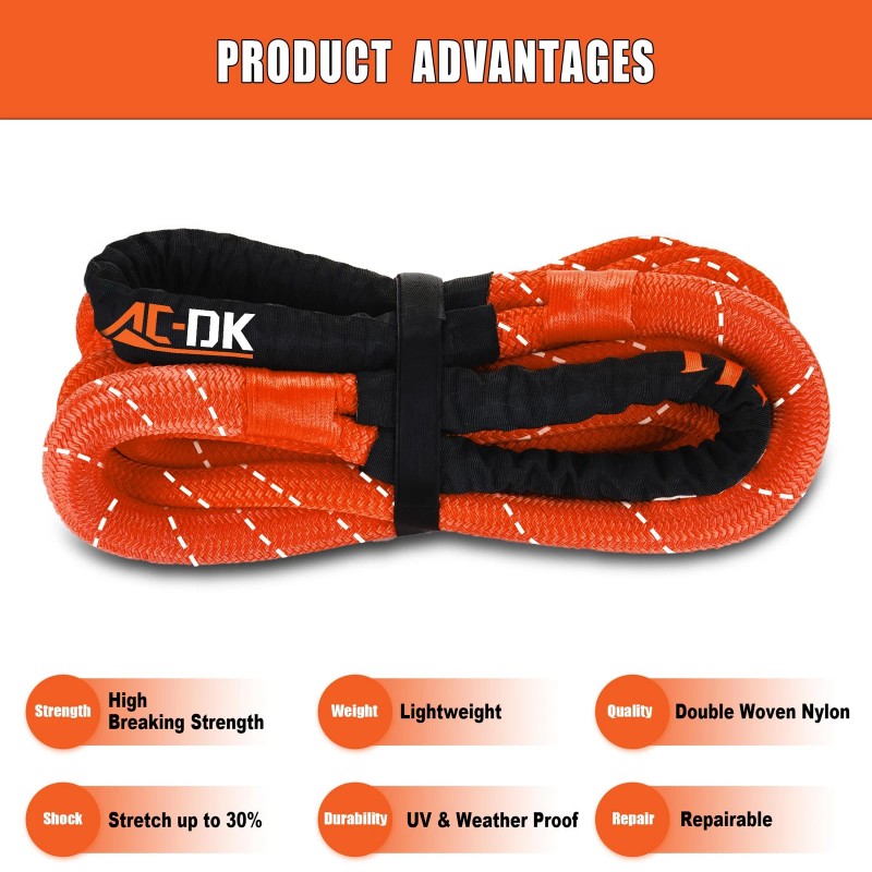 - 【Magic of Kinetic Energy Recovery】This kinetic towing strap has the capability of up to 30% to 35% elongation during rescue, more dynamic and elastic, which acts as a dynamic buffer for vehicles and reduces the impact load on the attachment point, will provide better protection for vehicles and less structural impact on vehicles compared to steel wire ropes. The rope stores energy during stretching and releases energy during towing to provide additional pulling force.