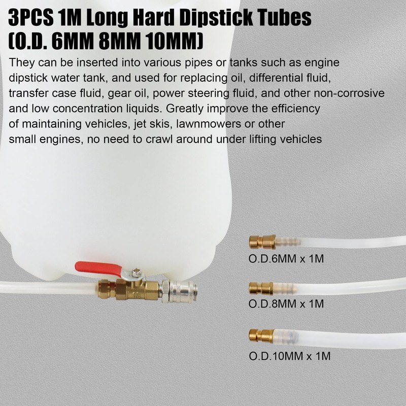 - Wide Application-- Transmission fluid pump set contains 3PCS 1M long hard dipstick tubes (O.D. 6MM 8MM 10MM). They can be inserted into various pipes or tanks such as engine dipstick water tank, and used for replacing oil, differential fluid, transfer case fluid, gear oil, power steering fluid, and other non-corrosive and low concentration liquids. Greatly improve the efficiency of maintaining vehicles, jet skis, lawnmowers or other small engines, no need to crawl around under lifting vehicles
