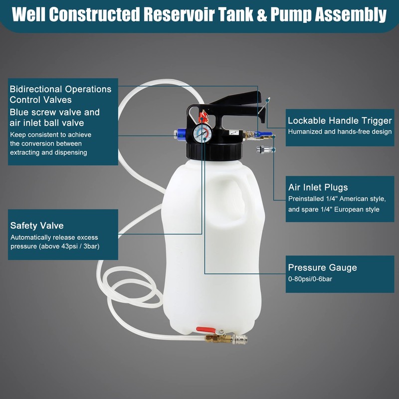 - Humanized Design-- This garage & shop fluid transfer unit consists of a pump assembly, a 10L pot and a 80" long main hose. The pump assembly is equipped with a lockable handle trigger to avoid prolonged pressing operation, a safety valve to automatically release excess pressure (above 43psi / 3bar) for safety, a 1/4 inch American air intake plug can be connected with air compressor for pneumatic operation saves time and effort. The oil can has 10L large capacity, strong structure and stable base