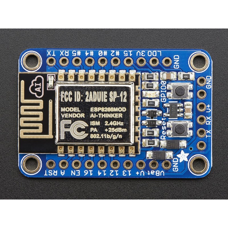 The Adafruit HUZZAH ESP8266 breakout is what we designed to make working with this chip super easy and a lot of fun. We took a certified module with an onboard antenna, and plenty of pins, and soldered it onto our designed breakout PCBs. We added in: