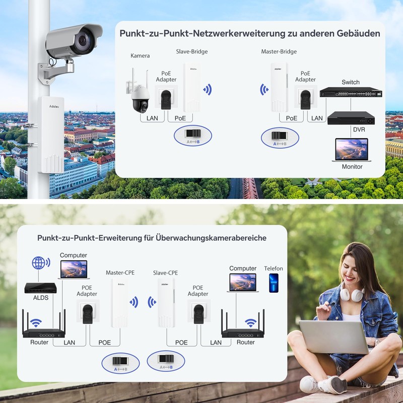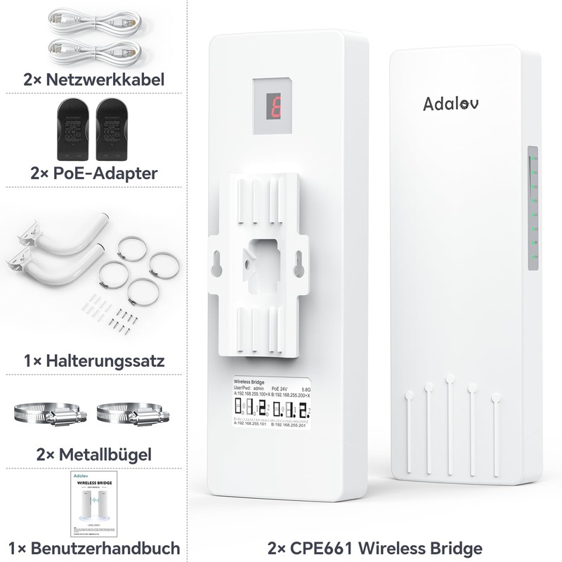 - Increase Wi-Fi with Smart Broadcasting: The secondary bridge of the Adalov CPE661 point-to-point bridge set now effortlessly transmits Wi-Fi, connects phones, cameras and tablets - transforms remote spots such as campsites or workshops into instant hotspots with seamless Internet access.