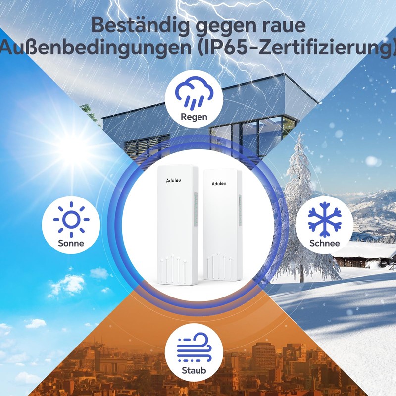 - Reliable 5.8 GHz connectivity: The Adalov Gigabit wireless bridge works on the 5.8 GHz frequency band and provides increased bandwidth for ultra-fast data transmission, superior interference resistance and low latency to ensure a stable connection for your shed, workshop, guest house.