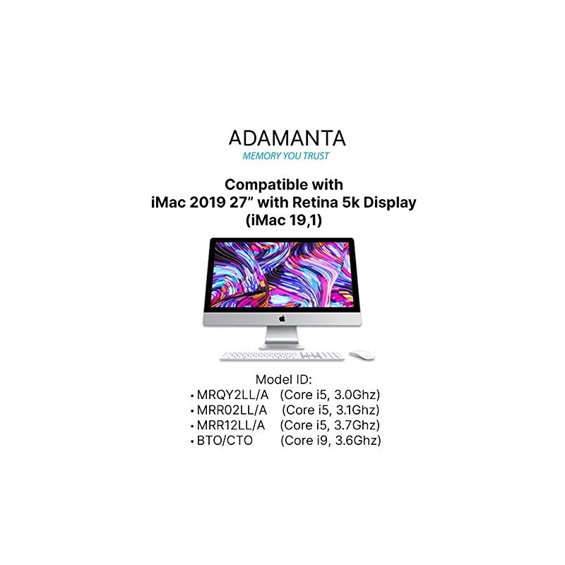 - Memory Upgrade Compatible with Early 2019 27-inch iMac w/ Retina 5K Display model ID: 19,1 (i5 3.0GHz, i5 3.1GHz, i5 3.7GHz, i9 3.6GHz)