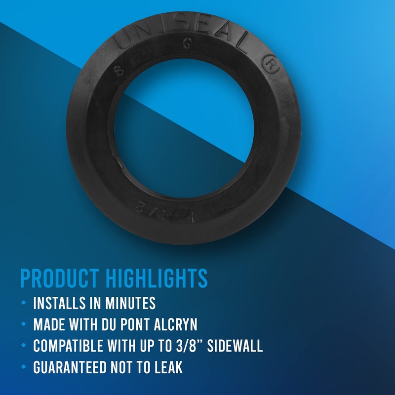 Uniseal es simplemente el mejor sello del mundo. También es increíblemente fácil de instalar. Después de cortar un agujero en la pared de un tanque u otra superficie, se inserta la junta. A continuación, la tubería está recubierta con un detergente resbaladizo (es decir, jabón de platos) y empujar en el sello. Los productos unisex reemplazan los accesorios de fontanería tradicionales con una sola unidad moldeada por inyección que no requiere piezas de componentes. Fue diseñado para resolver muchos de los problemas de conexiones de tubería a tanque. Para muchas industrias, las juntas de tubería a tanque se encuentran tradicionalmente entre las conexiones más complejas de fabricación. Los sellos tradicionales requieren varias piezas como bridas rígidas, pernos, arandelas, juntas tóricas, junto con largos tiempos de montaje y altos costos de producción. El Du Pont Alcryn es la clave del sello hermético. Cuando la tubería se empuja a través de la goma unisex desde el exterior, la pared interior de Alcryn se vuelve lo suficientemente delgada como para permitir que la tubería se deslice y luego forma un sello hermético. El coeficiente de fricción con el tubo de plástico es aproximadamente tres veces más alto que cualquier otro material, lo que le permite crear un mejor sellado que con cualquier otro material. En condiciones estáticas, el sello es bueno hasta 65 PSI. Uniseal puede soportar la presión y succión, ácidos, aceites, grasas, gasolina, aguas residuales, calor y frío. Ofrece una larga vida útil, fácil instalación y reducción de costos de mano de obra y material.